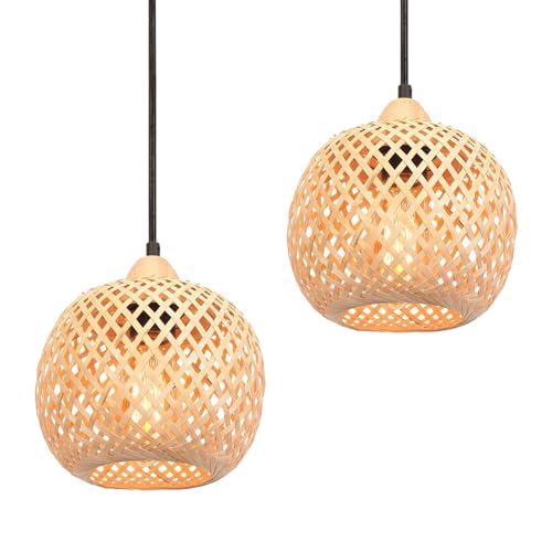 Hänglampor i naturlig bambu, 2-pack hängande rottingvävning retro ljuskrona taklampa justerbar höjd för vardagsrum sovrum hall, 20 cm