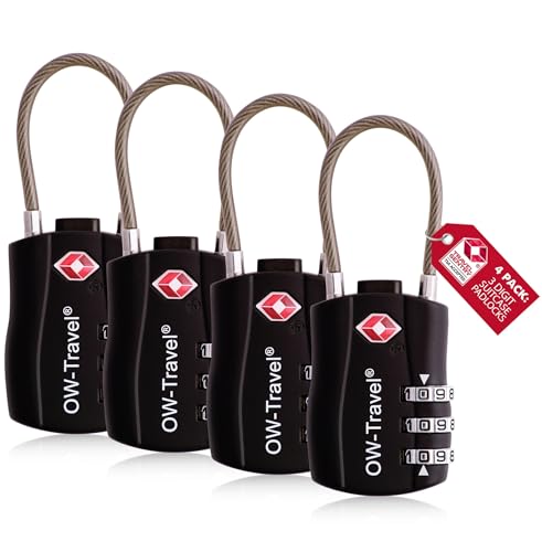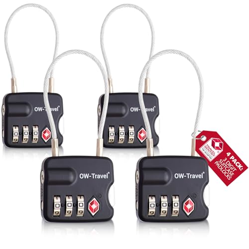 OW-Travel TSA-godkänd Kabellås (Svart 4-pack) 3-siffrig kod TSA Lås Godkänd Säkerhet Ryggsäck Hänglås Resväska, Lås, Kombinationslås med Kabel resväska lås, Gymskåp, Hänglås