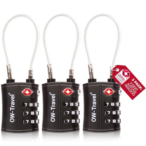 OW-Travel TSA-godkänd Kabellås (Svart 3-pack) 3-siffrig kod TSA Lås Godkänd Säkerhet Ryggsäck Hänglås Resväska, Lås, Kombinationslås med Kabel resväska lås, Gymskåp, Hänglås
