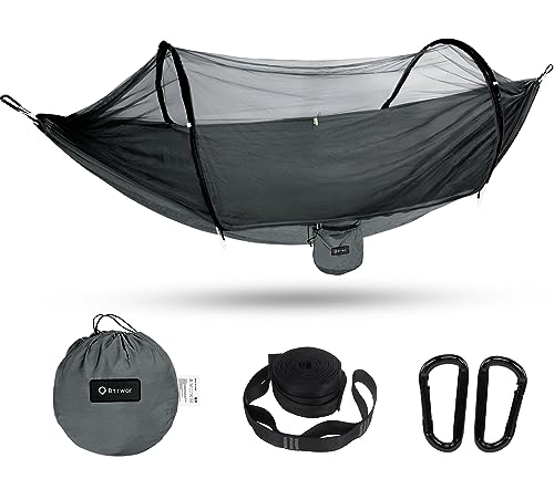 BTRWOR Hängmatta, hängmatta utomhus med myggnät | nylon camping resehängmatta | 300 kg lastkapacitet | 260 x 140 cm | Campingtillbehör för utomhusbruk, inomhus med trädremmar (mörkgrå)