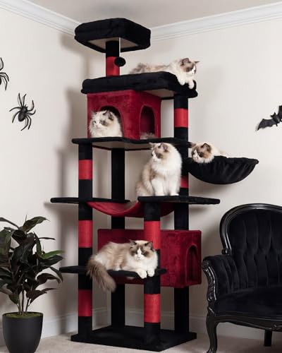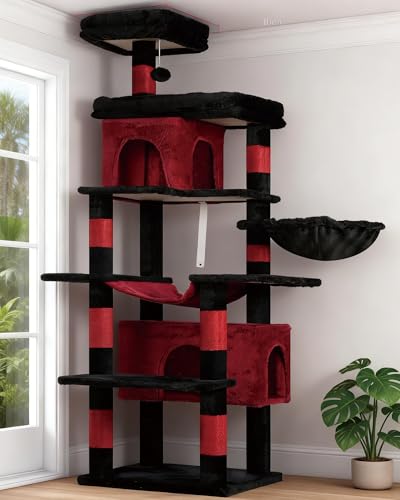 Heybly Katträd, 178 cm högt, pelare där innekatter kan vässa klorna, katträd med flera avsatser och åtta pelare för att vässa klorna, två hål, två plattformar, hängmatta, korg, svart och rött