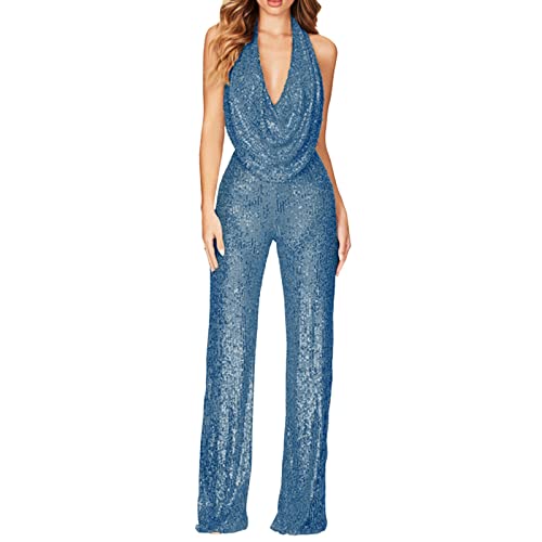 Jumpsuit paljetter dam hängselbyxor lös passform säckig jumpsuit ärmlös overall axelfri i ett stycke klubbkläder elegant fest kväll jumpsuit lekdräkt glitter sparkbyxor V-ringad hängselbyxor, blå, M