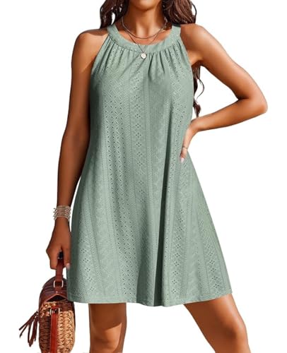 JFAN Sommar dam ärmlös klänning med rund hals klänning virkat linne ihålig hängselklänning casual, Färg: grön, M