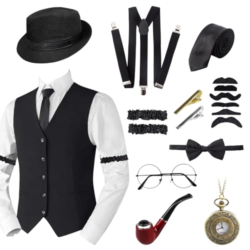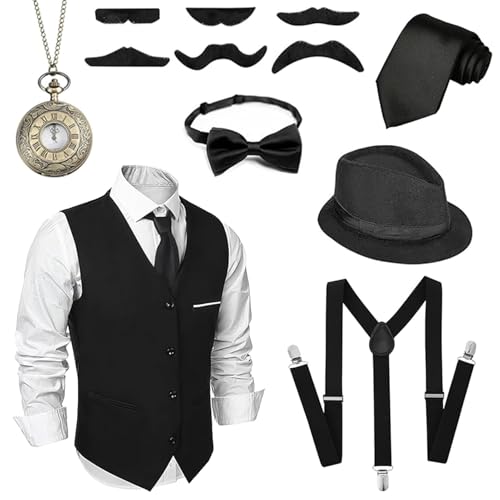 PLULON 1920-tals accessoarer kläder kostym outfit med väst Fedora hatt fickur hängslen slips för män
