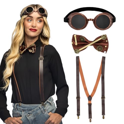 Boland 54583 – steampunk kostym-set för vuxna, glasögon, fluga och hängslen, tillbehörssats för karneval eller temafest