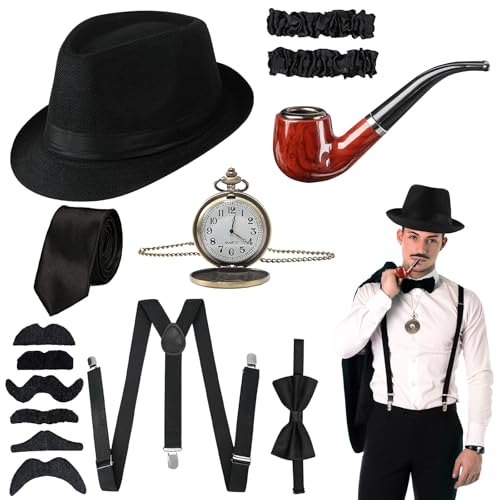 Wagoog 1920-talet herrtillbehör, mafia Gatsby-kostym, set inklusive Panamahatt, justerbara, elastiska hängslen, män, halsband, fluga och vintage fickur