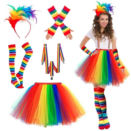 DUOLAM Regnbåge Tutu-kjol för kvinnor: tyllkjol med pannband med regnbågsfjädrar, hängslen, knästrumpor, fingerlösa handskar, 80-tals-kostym, för karneval, halloween, festlig karneval