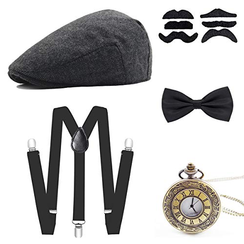 Jinlaili 1920-talet Herr Accessoarset, Gatsby Kostym Kit med Beret, Elastiska Y-Back Hängslen, Vintage Fickklocka, Justerbar Fjäril Och Falsk Mustasch Cigarr, för maskerad fest