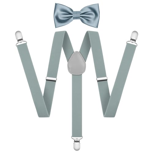 AOOWU Breda hängslen med fluga i ett set, 2,5 cm hängslen, justerbara hängslen med fluga för män med mycket starka 3 metallklämmor, en storlek för män och kvinnor (kostym, ljusgrå, vuxen)