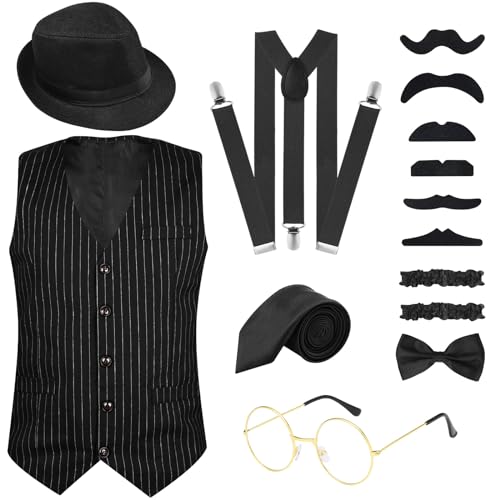 10-delars kostymset för vuxna/män, 1920-talet, Roaring Retro 20s, Gatsby Gangster-kostym med väst, åttakantig keps, fluga, manschettknappar, glasögon, mustasch, slipsnål, hängslen och fickur som