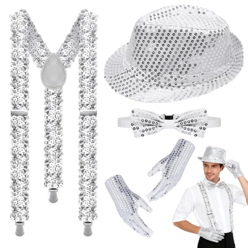 Anyingkai 4 set paljetter cylinderhatt hängslen, paljetter slips män, paljetter hängslen set, glitter fluga och hängslen män, män hatt guld paljett set för karneval kostym tillbehör, silver