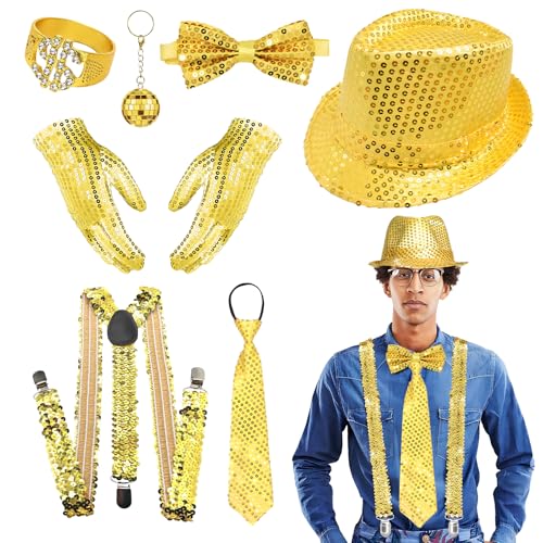 EUPSIIU 3 delar discokostym guld jazz paljetter hatt glänsande hängslen fluga, 70-tals paljetter tillbehör för vuxen hiphop kostym glitterhatt för halloween maskeradfest (guld)