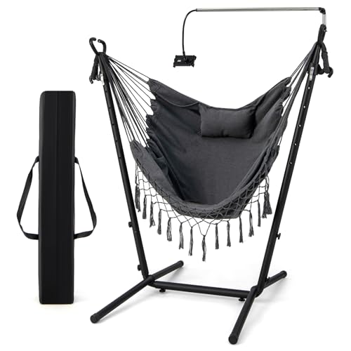 KOMFOTTEU Hängstol med stålram, justerbar höjd, hängsits, hängstol med mobiltelefonhållare, hängande gunga med kudde och sidoficka, hängfåtöljram för inomhus utomhus, grå