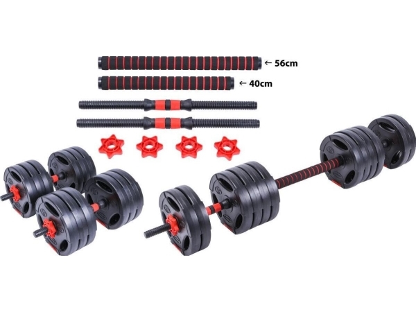 C.P.Sports 2in1 hantel- och skivstångsset 30kg | 4x 1,25kg - 4x 1,5kg - 4x 2,0kg - 4x 2,5kg vikter - 2x handtag | Plast viktskivor för styrketräning, fitness, hemmagym | röd-svart