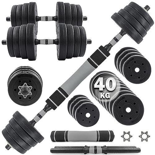C.P.Sports 2in1 hantel- och skivstångsset 40kg | 4x 1,25kg - 6x 2,5kg - 6x 3,0kg vikter - 2x handtag | plastskivor för styrketräning, fitness, hemmagym
