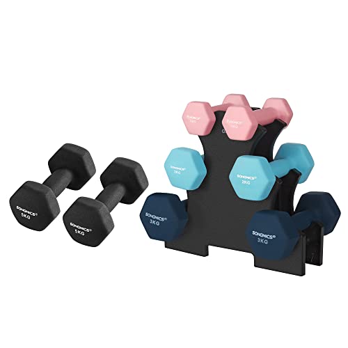 SONGMICS Hantlar, hantelset 2 x 5 kg, hantlar med hantelställ 2 x 1 kg, 2 x 2 kg, 2 x 3 kg, styrketräning, hemma, på kontoret, gym, svart, rosa, akvamarin och blå SYL60MK