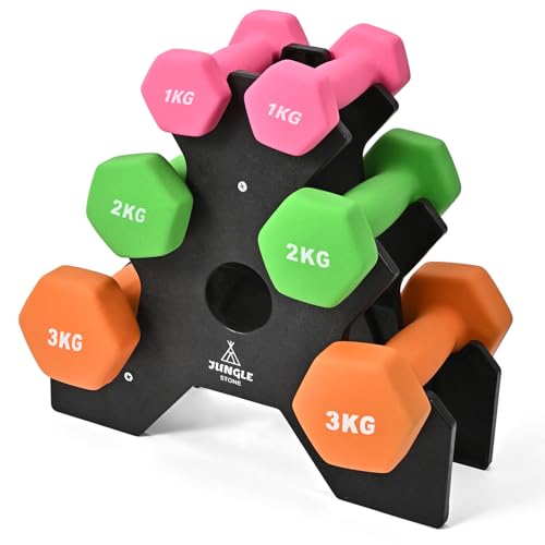 JUNGLE STONE Neopren hantelset med stativ, handvikter för kvinnor män arm pilateset, 2 x 1 kg, 2 x 2 kg, 2 x 3 kg, neopren matt finish för hemträning