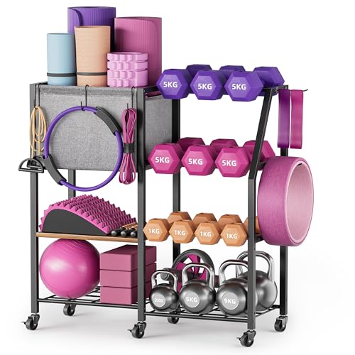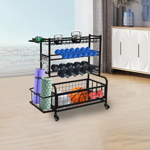 ZACHVO Hantelställ, viktställ för hantlar, hemmagym förvaring för hantlar kettlebells yogamatta och bollar, allt i ett träningsförvaring med hjul och krokar, pulverlackerat stål