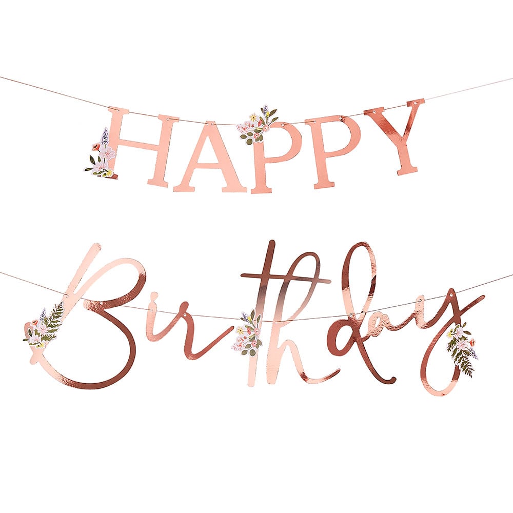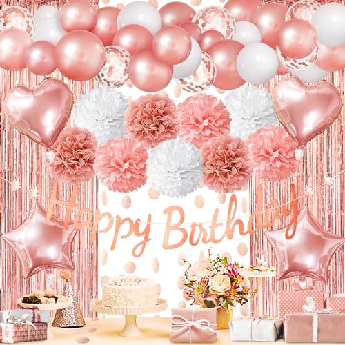 ZERODECO Roséguld, födelsedag, fest, dekoration, Happy Birthday-banderoll med vävnader, pom poms, blomma, ballong för födelsedag, fest, dekorationer