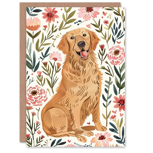 Artery8 Happy Golden Retriever and Pink Flowers Dog Lover For Her Woman Birthday Card