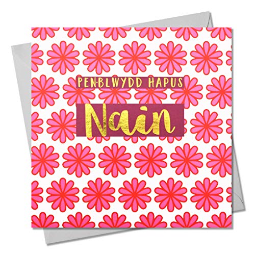 Welsh Happy Birthday gratulationskort nan, rosa blommor, gratulationskort med text folie i glänsande guld, penna-blwydd Hapus Nain
