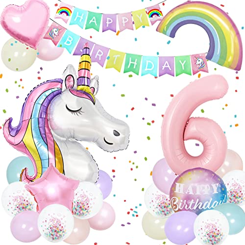 Enhörning födelsedagsdekoration, 3D enhörning ballong, jättefolieballong makaron 6, enhörning folieballong set med Happy Birthday-banner, regnbåge molnballonger för flickor födelsedag festival dekoration