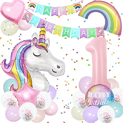 Enhörning födelsedagsdekoration, 3D enhörning ballong, jättefolieballong makaron 1, enhörning folieballong set med Happy Birthday-banner, regnbåge molnballonger för flickor födelsedag festival dekoration
