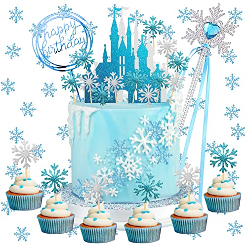 BOYATONG Dekoration för tårtor, snöflinga, Happy Birthday, dekoration för tårta, slott vit, silverfärger, paljetter, för flickor, till födelsedag, bröllop