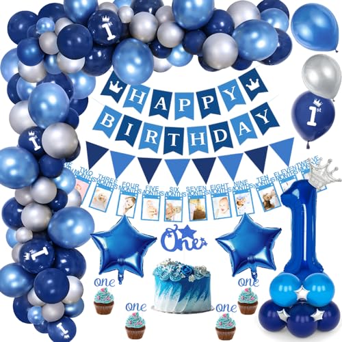 1:a födelsedag dekorationer för pojkar, dekoration för första födelsedagsfesten med fotobanderoll, blå silver latexballonger, Happy Birthday-banderoll, folieballonger med stjärna, för pojke och baby shower