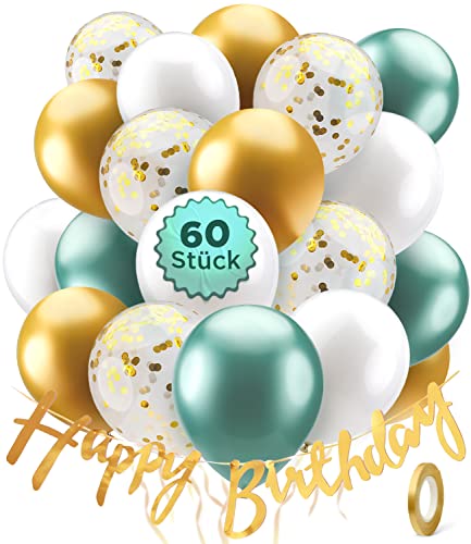 Balloono Set med 60 ballonger födelsedag med Happy Birthday-banderoll – all-i-ett födelsedagsdekoration – dekoration födelsedag – ballonger födelsedag – grön guld vit