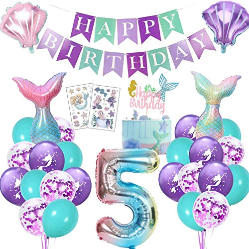 KKSJK Sjöjungfru födelsedag dekoration 5 år, barns födelsedagskalas ballong flicka, sjöjungfrutema party set med folieballong, Happy Birthday-girlang, tårtdekorationer och tatueringar