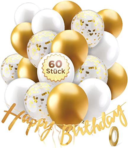 Uppsättning av 60 ballonger födelsedag med Happy Birthday-banderoll – all-i-ett födelsedagsdekoration – dekoration födelsedag – ballonger födelsedag – vitt guld