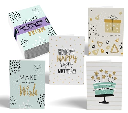 Better Office Products Happy Birthday-kort, 100-pack, 10 x 15 cm, 4 omslagsdesigner, tom inuti, med kuvert, elegant guldkollektion, 100-pack