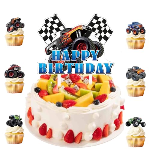 25 stycken monster truck tårtdekorationer set – Happy Birthday-tårta toppers för pojkar – muffinsdekorationer, bilcupcake-toppar, födelsedagstårta tillbehör för barn