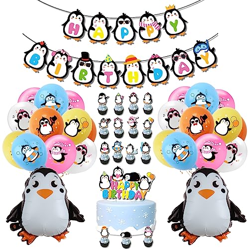 SUNSK Födelsedagsballonger pingvin djurballonger rund latexballong XXL folieballonger Happy Birthday-girlang tårta toppers födelsedagsdekoration för barn 39 stycken