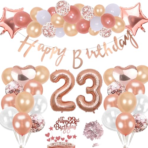 23. Födelsedagsdekoration roséguld set, helium hjärta nummer folieballonger Happy Birthday-banderoll ballonger konfetti bord ballonger tårta dekoration present för 23 år flicka kvinna kvinnor party