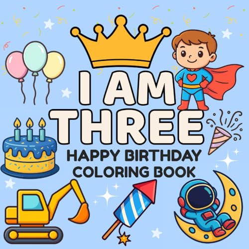 I am Three Happy Birthday Coloring Book For Boy: Bold & Simple Birthday Coloring book for Boy, Featuring Cute Cake, Animals, Balloons, and Adorable ... and Easy Designs (Gift for 3 Year Old Kids)