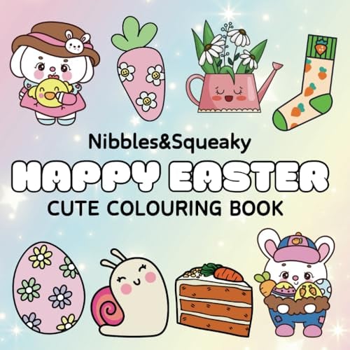 Happy Easter Cute Colouring Book, Adorable Bunnies Funny Animals Cozy Designs: Kawaii Easter Eggs, Cake, Flowers, Rabbit, Chicks