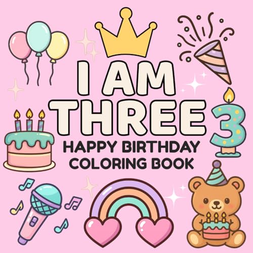 I am Three Happy Birthday Coloring Book: Bold & Simple Birthday Coloring book for Girls, Featuring Cute Cake, Animals, Balloons and Adorable ... and Easy Designs (Gift for 3 Year Old Kids)