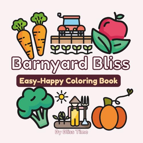 Barnyard Bliss Easy-Happy Coloring Book: Bold and Easy Large Print Coloring Book. Enjoy a simple, fun, cozy Gift Book Featuring 50+ Easy designs for ... these animals, fruits, veggies, and barns.