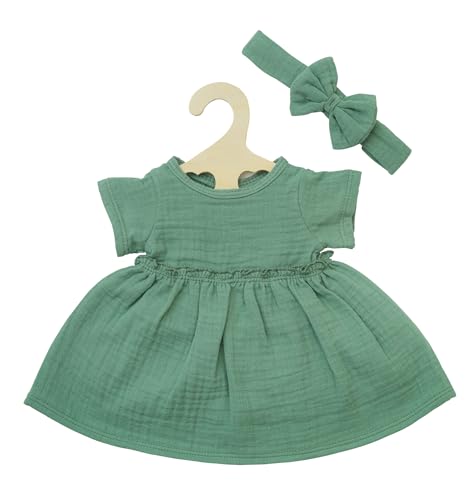 Heless 1424 – Dockkläder av 100 % ekologisk bomull, 2-delat set med klänning och hårband i salviagrönt för dockor och gosiga leksaker i storlek 28–35 cm