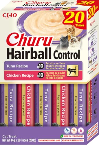 INABA Churu Hairball Control anti-hårboll premium kattgodis med taurin och fiber, kyckling och tonfisk 20 x 14 g | Kornfri, sockerfri, inga biprodukter, anti-hårbollar katt