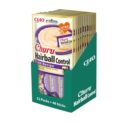 INABA Churu hårboll kattgodis för att förhindra pälsbollar - tonfisksmak, 12-pack (48 pinnar x 14 gr) – kattmat med Omega 3 och 6, Taurin och vitamin och mot hårboll, funktionsmat