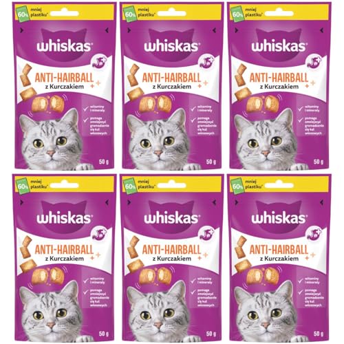 WHISKAS Anti-hårboll kattsnacks 6 x 50 g - läckra snacks mot hårbollar för frisk päls