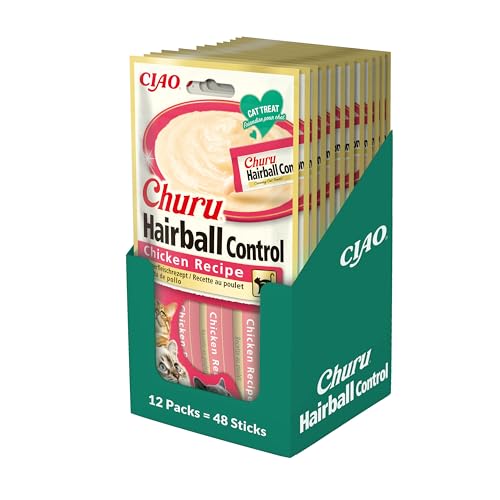 INABA Churu hårboll kattsnacks för att förhindra pälsbollar - kycklingsmak, 12-pack (48 pinnar x 14 gr) – kattmat med Omega 3 och 6, Taurin och vitamin och mot hårbollar, funktionsmat
