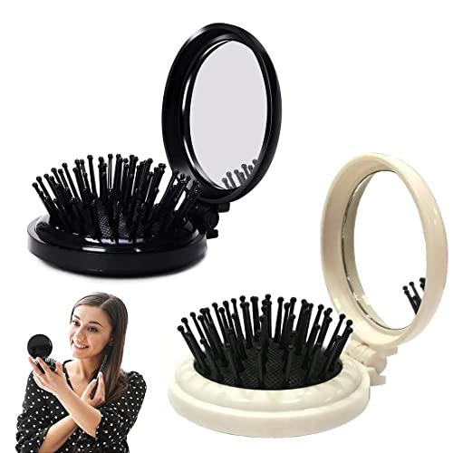 LICHUAN 2-pack vikbara hårborstar med resespegel rund bärbar vikbar väska hårborste mini hårkam kompakt resestorlek hårmassagekam för män kvinnor och flickor (vit/svart)