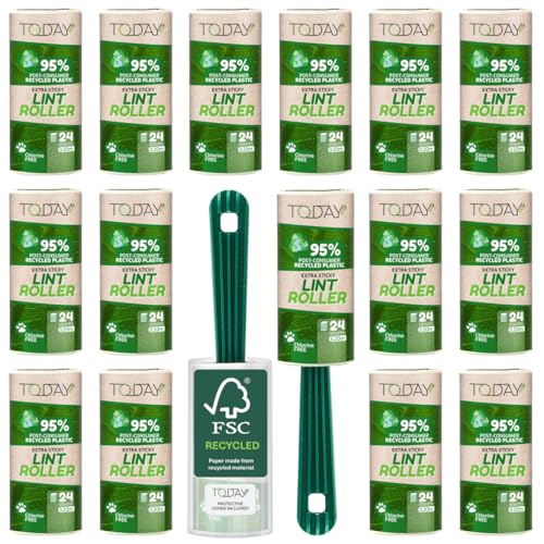 TODAY ECO Luddrullar 95 % Återvunnet – 16 Rullar + 2 Handtag + Skydd. Luddborttagare i Återvunnen Plast för Katt- och Hundhår, Extra Klistrig Hårborttagare för Husdjur