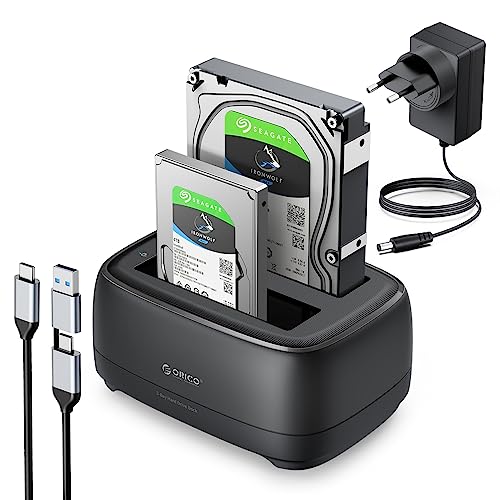 ORICO Dockningsstation med dubbla fack USB 3,2 Gen 1-hårddiskhölje för alla standard 2,5 tum och 3,5 tum HDD/SSD upp till 2 x 20 TB med 12 V 3 A strömförsörjning, verktygsfritt och UASP-stöd (DD28C3)