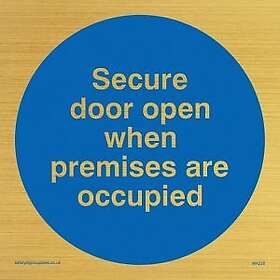 Viking Signs MA222-S15-G "Secure Door Open When Premises Are Occupied"-skylt, hårdplast i styv guld, 150 mm x 150 mm