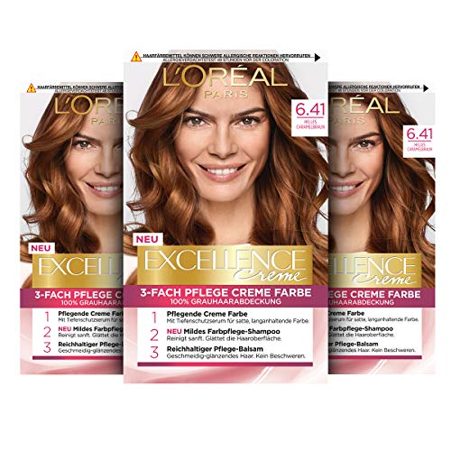 L'Oréal Paris permanent hårfärg, 100% grått hårskydd, hårfärgningsset med färgning, schampo och 3-vägs vård krämfärg, utmärkt, 6,41 ljus karamellbrun, 3 x 268 g